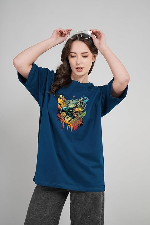 FieryFrost Women’s Pure Cotton Half Sleeve Colorful Butterfly Printed Oversize Tshirt